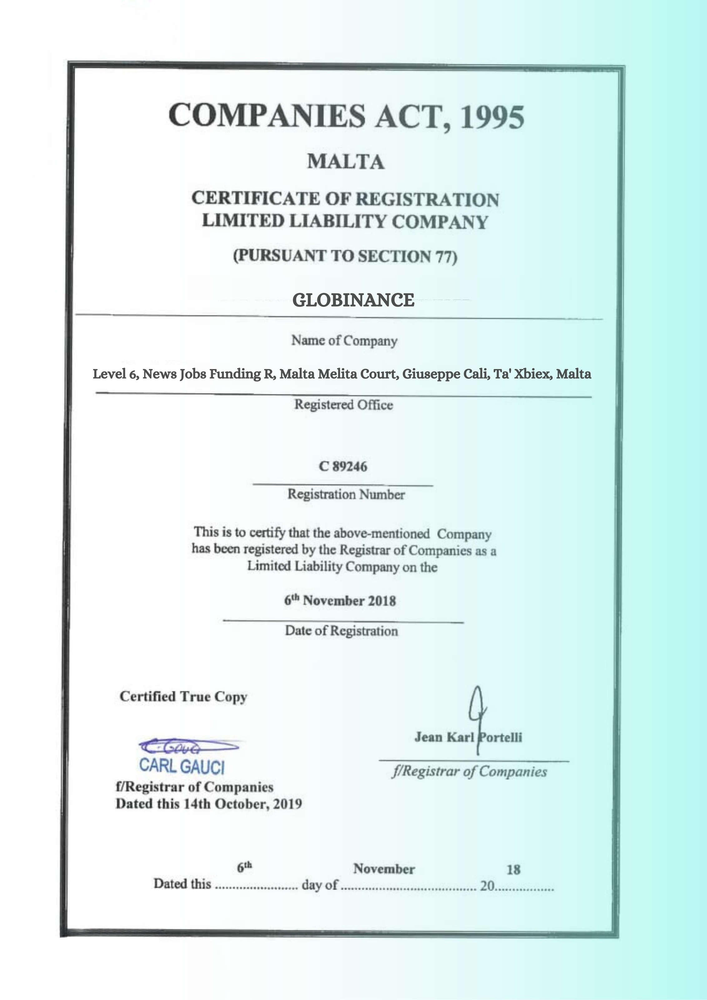Globinance is a registered and fully authorized firm in the finance industry. Our company operates with official permission, offering a comprehensive range of services tailored to meet the diverse needs of investors worldwide. Whether you're an individual investor or a corporate entity, our platform provides accessible and transparent opportunities for financial growth.